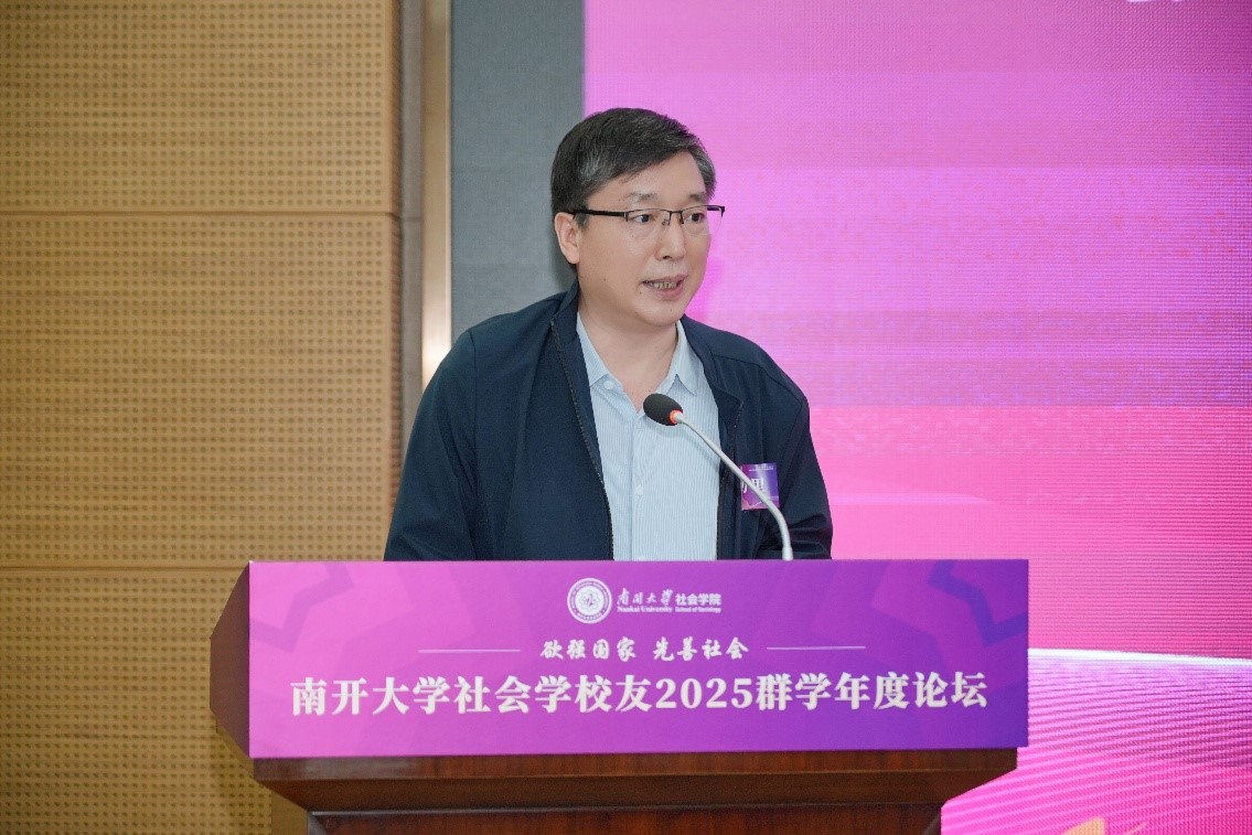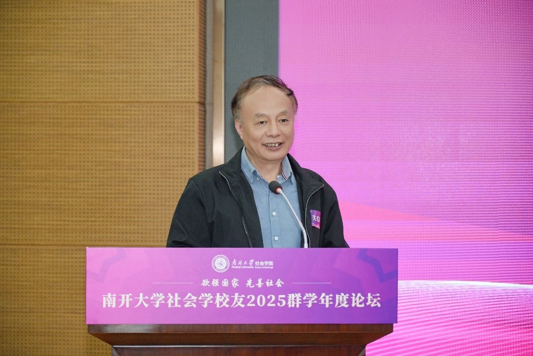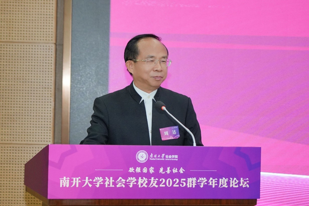 南开校友总会副理事长、南开深圳校友会终身荣誉会长、昆仑集团创始人董事长、南开大学资深校董、南开校友总会社会学分会会长、1987级社会学硕士校友周达致辞。他说,国家之间的竞争归根结底是科技和治理能力结构现代化的竞争。中华民族要实现伟大复兴,离不开治理的现代化,离不开高校的持续性发展。南开大学社会学校友会成立至今已经探索出有效的工作模式,群学论坛、“群学南开·游学中国”已经成为品牌项目。