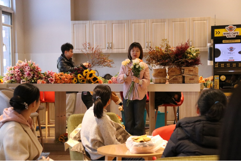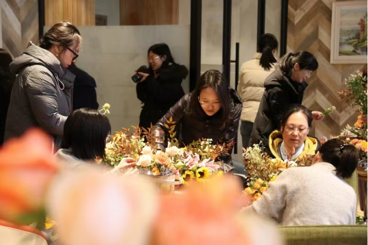 一楼咖啡厅花香扑鼻、色彩斑斓。在专业花艺师为大家讲解了常见花材品种、等级、习性与养护等基础理论知识后,现场师生投入到艺术构思和实操练习中。大家修剪枝叶、搭配颜色、设计造型,亲手制作出一件件充满匠心和个性花艺作品。大家纷纷举起手机相机、拍照留影,定格这一温馨美好时刻。(文/佘蕙文 图/蒋芙薱)