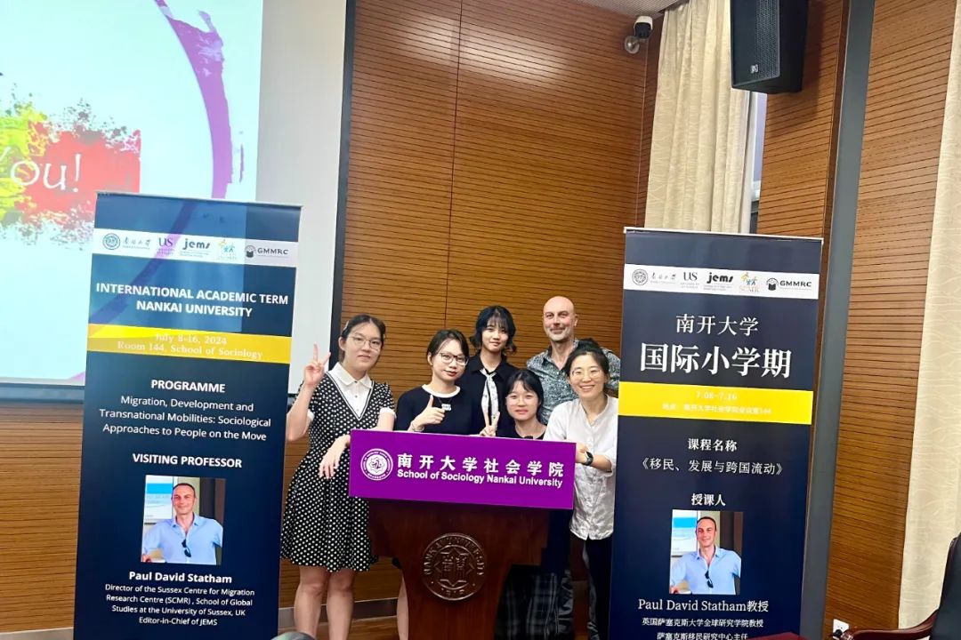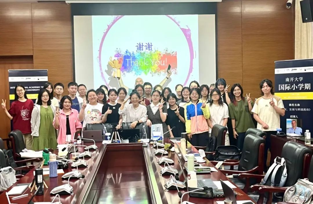 为了表达对Paul教授的感谢,在结课时,王炳钰教授和同学们一同送给他南开大学的文创本并在其上留言。同学们纷纷表示在此次课程中受益匪浅,不仅开阔了视野、增强了对移民研究领域的兴趣,还丰富了自己的社会学想象力。最后,炳钰教授和同学们给Paul David Statham教授送上鲜花,并共同合影留念。至此,国际学期圆满结束。