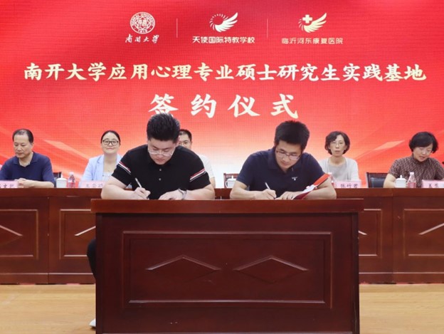 教师吕小康、王崇颖分别代表南开大学与天使教育集团执行董事长、临沂河东康复医院院长王智超签订了应用心理专业硕士研究生实践基地合作协议和孤独症研究中心研究生实践基地合作协议。临沂市残联,临沂市河东区残联,河东区委教育工委,天使教育发展集团和河东康复医院的主要负责人一同出席并为实践基地揭牌。
