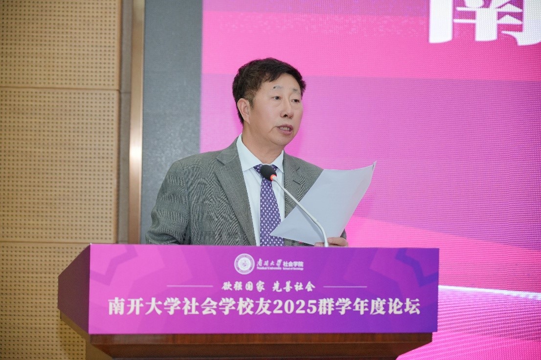 南开校友总会副理事长、南开深圳校友会终身荣誉会长、昆仑集团创始人董事长、南开大学资深校董、南开校友总会社会学分会会长、1987级社会学硕士校友周达致辞。他说,国家之间的竞争归根结底是科技和治理能力结构现代化的竞争。中华民族要实现伟大复兴,离不开治理的现代化,离不开高校的持续性发展。南开大学社会学校友会成立至今已经探索出有效的工作模式,群学论坛、“群学南开·游学中国”已经成为品牌项目。