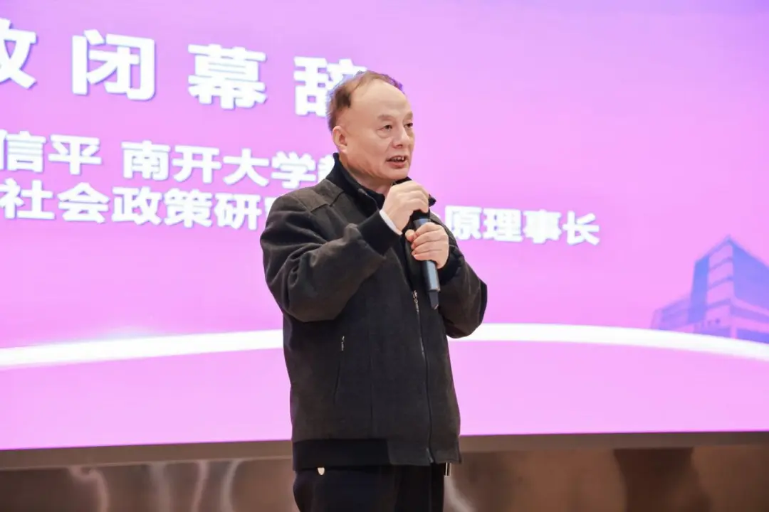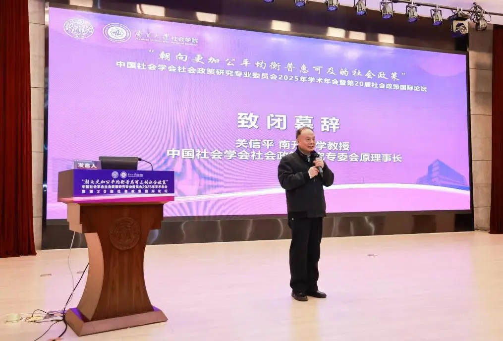 中国社会学会社会政策研究专业委员会原理事长、南开大学社会建设与管理研究院院长关信平致闭幕辞。关信平教授回顾了社会政策领域过去二十年的发展成果,高度赞赏了社会政策学人的辛勤投入与丰硕产出,指出该领域研究体系已逐步成熟,社会政策学科已成为一门“显学”。但新时期的社会政策研究仍面临新挑战,仍需持续关注并积极回应。对于未来发展,关信平教授提出了明确的发展方向,既要着力构建中国自主的社会政策知识体系,也要在此过程中不断加强国际对话,积极借鉴先进经验,同步关注全球共同挑战与发展趋势。