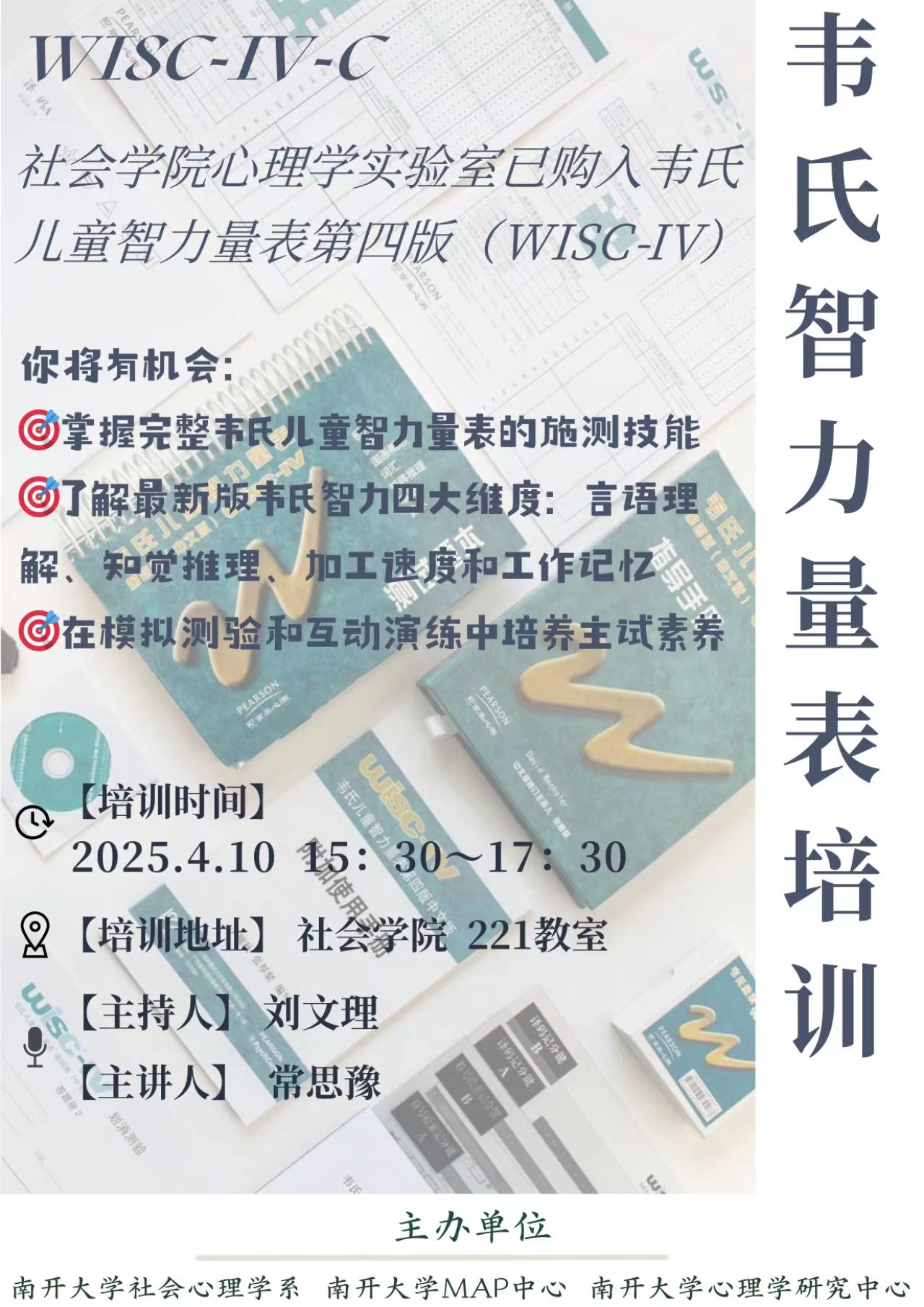 心理学实验室已购入韦氏儿童智力量表第四版(WISC-IV)。WISC-IV可用于儿童及青少年的认知能力评估,在特殊教育、心理咨询、学业支持、临床诊断及学术研究等多个领域均具有重要价值。为了帮助同学们更好地理解和应用该版智力测验,特组织一次学习交流会。本次交流会由一位经美国培生公司授权、具备WISC-IV主试资格的本院同学进行分享。