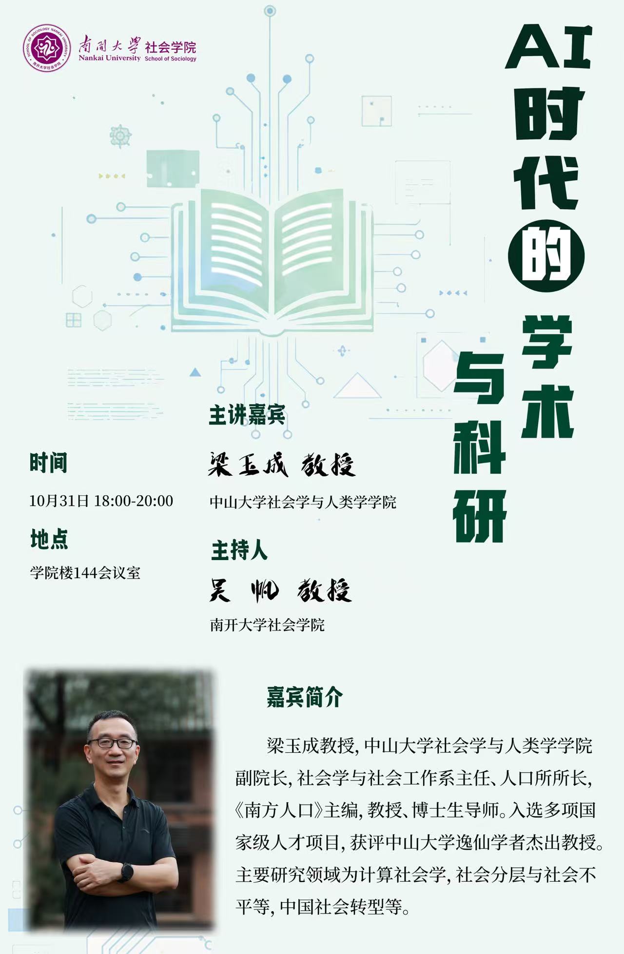 梁玉成,中山大学社会学与人类学雷速即时比分 副院长,社会学与社会工作系主任、人口所所长,《南方人口》主编,教授、博士生导师。入选多项国家级人才项目,获评中山大学逸仙学者杰出教授。主要研究领域为计算社会学,社会分层与社会不平等,中国社会转型等。
