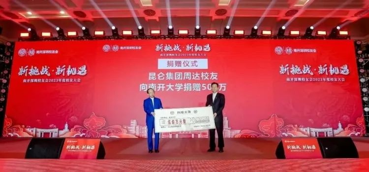 11月25日,在南开深圳校友会2023年度校友大会上,1987级社会学硕士校友、南开大学资深校董、昆仑集团创始人董事长、深圳校友会会长周达,捐赠人民币500万元支持南开大学社会学学科发展。