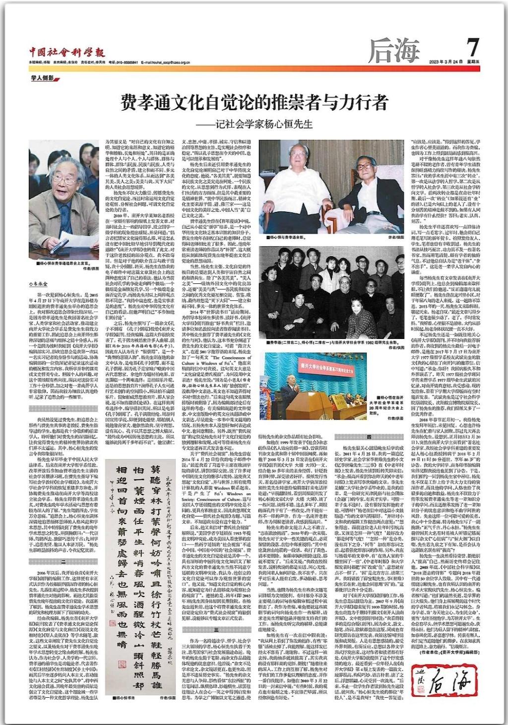 2006年以后,我开始负责《南开大学报》副刊的编辑工作,这样便有幸正式认识作为校报副刊资深作者的杨心恒先生。几番往来过程中,杨先生多次提到费孝通先生对他的影响,而他尤其推崇费先生晚年提出的文化自觉论。我逐渐了解到,杨先生在费孝通先生学术思想的研究和梳理方面下了很深的功夫。