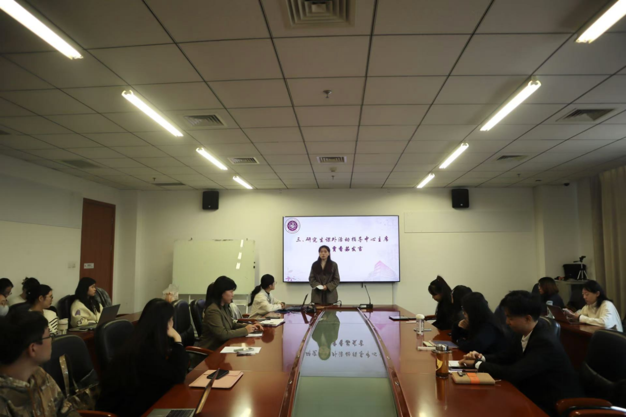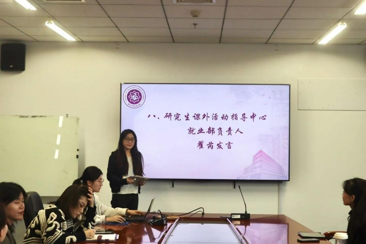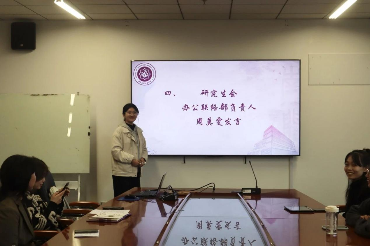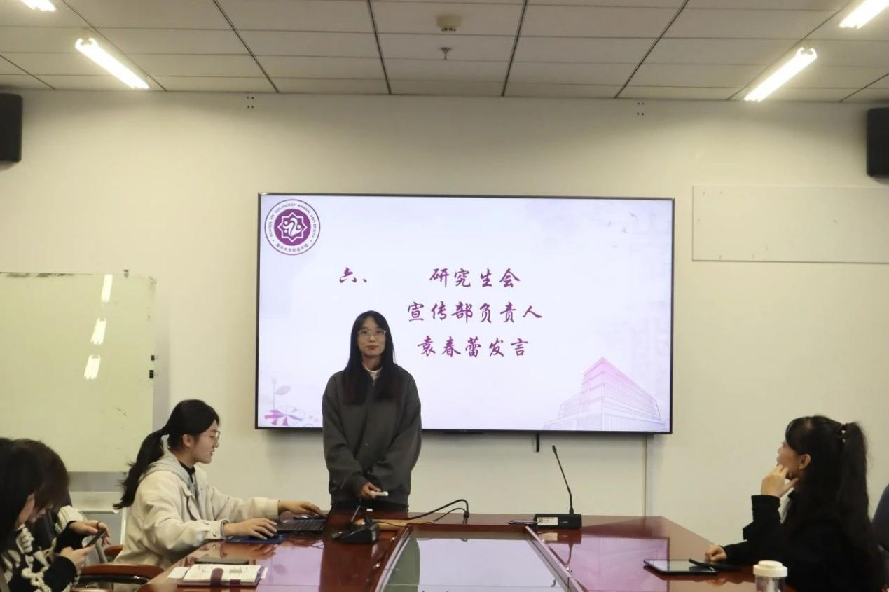 324召开,本次会议由研究生会办公联络部部长周莫雯主持,研究生会、研究生课外活动指导中心指导老师陈佩其、主席团成员、各部门部长和部员参与。