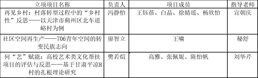 日前费孝通田野调查资助项目结果公布,共有50个项目获得资助。我系获得资助的3个项目是,2020级社会学专业本科生冯静怡团队的《再见乡村:村落转型过程中的“乡村性”反思——以天津市蓟州区北车道峪村为例》、2020级社会学专业本科生廖智立团队的《社区空间再生产——706青年空间的转变民族志向》、2021级社会学专业本科生樊若煊团队的《何“艺”赋能:高校艺术类文化帮扶项目的评估与反思——基于甘肃平凉H村的扎根理论研究》,研究领域涉及乡村振兴和文化研究两个方面,申报学生的年级横跨2020级到2022级。我系学生外,项目也吸纳行政管理、PPE、视觉传达设计、历史等专业的学生共同合作参与。